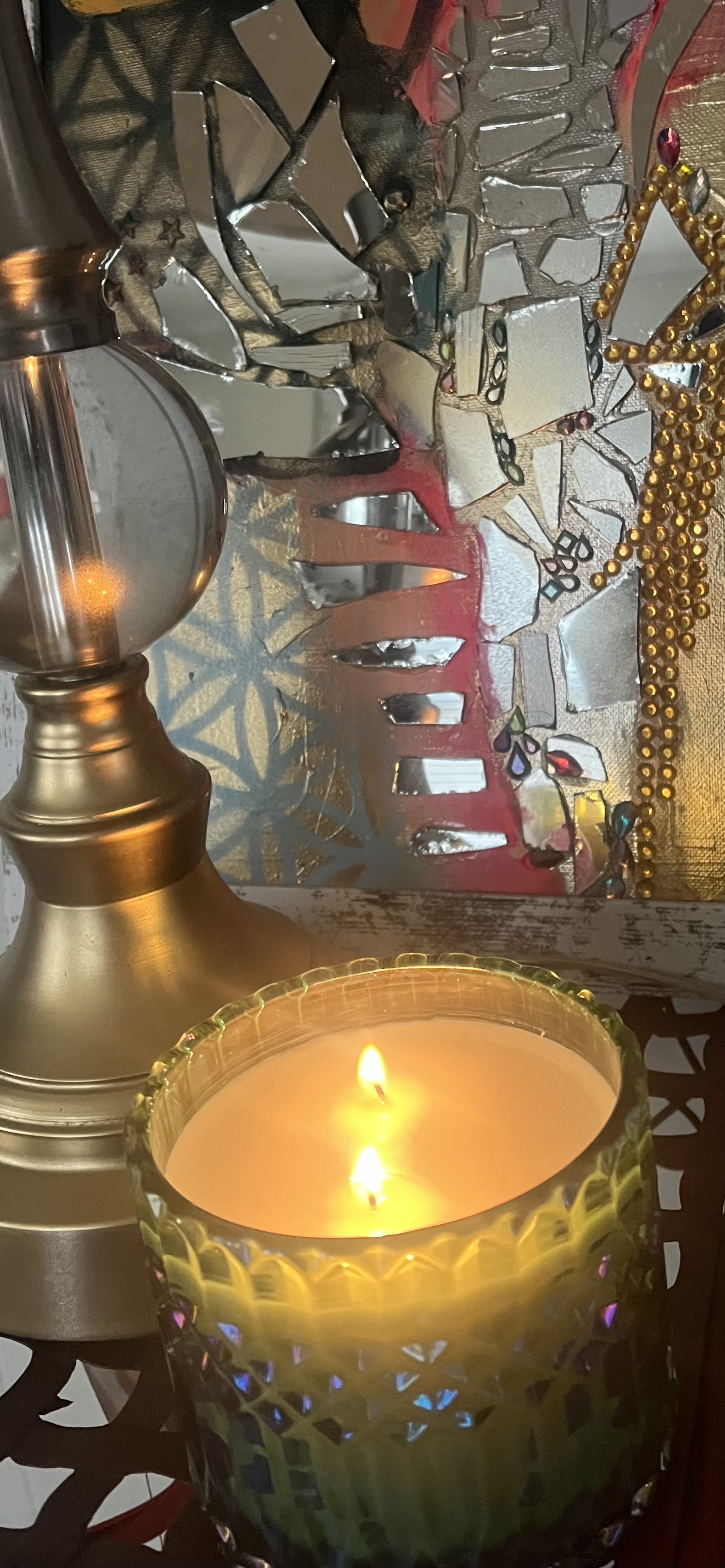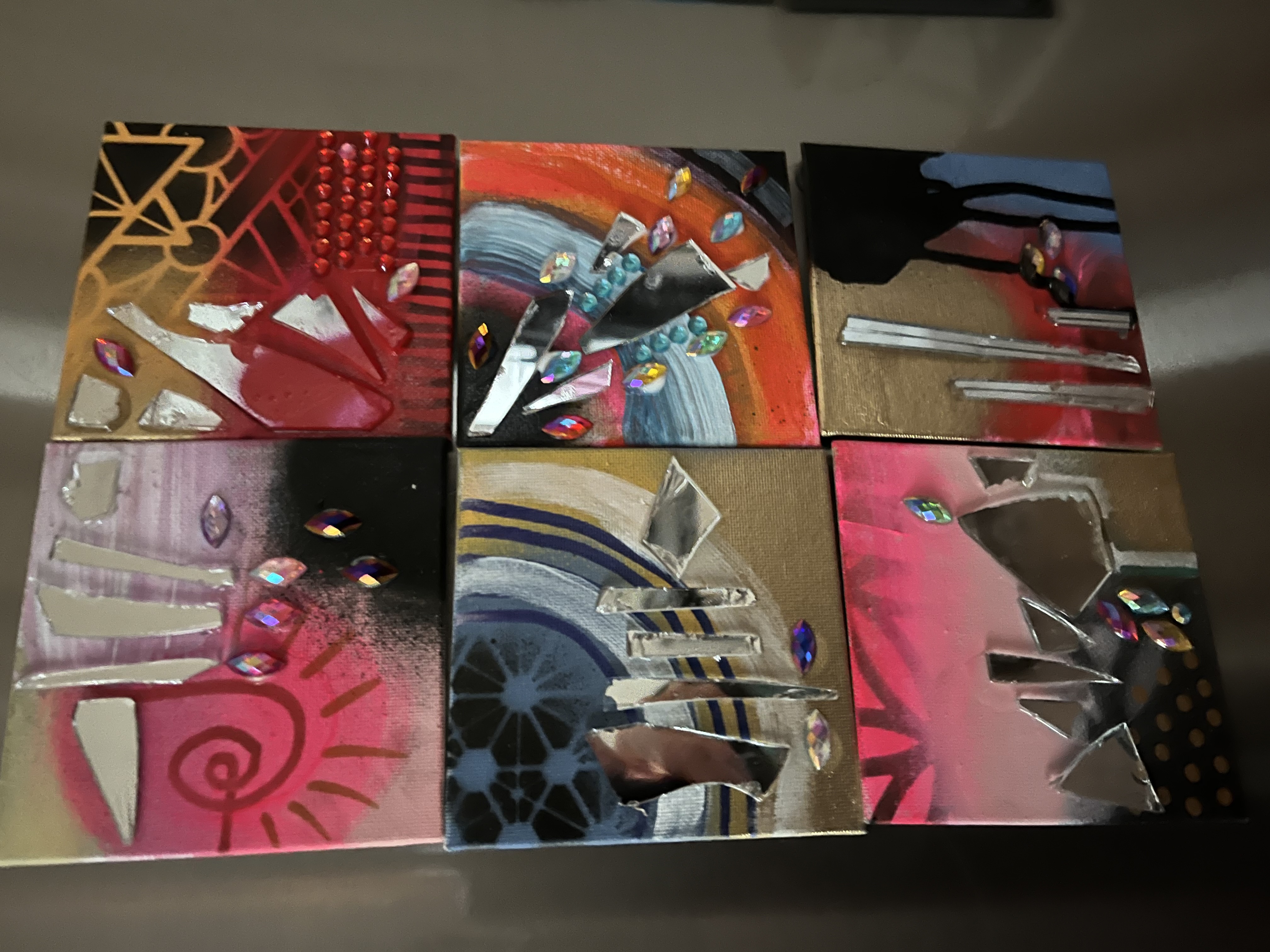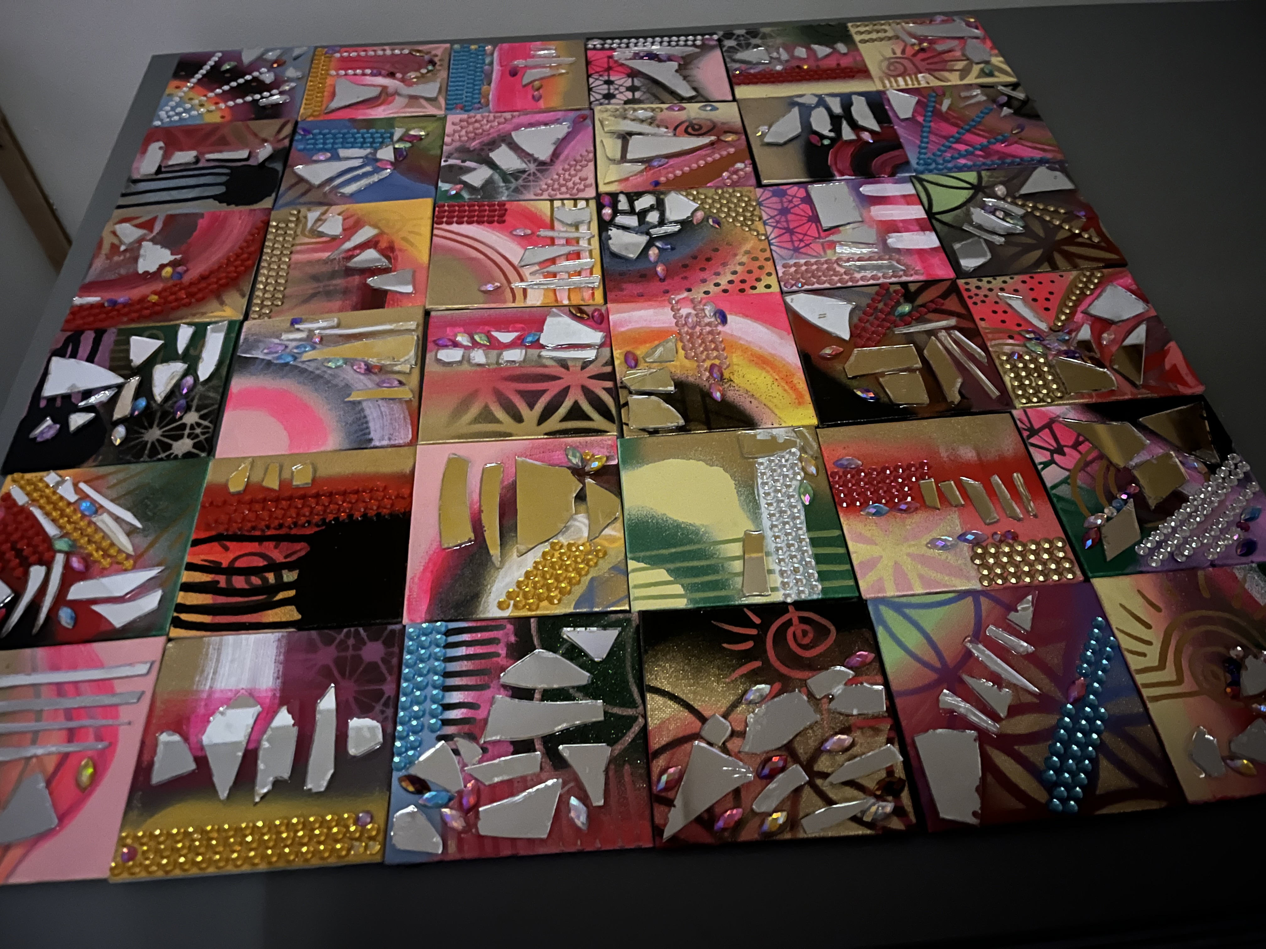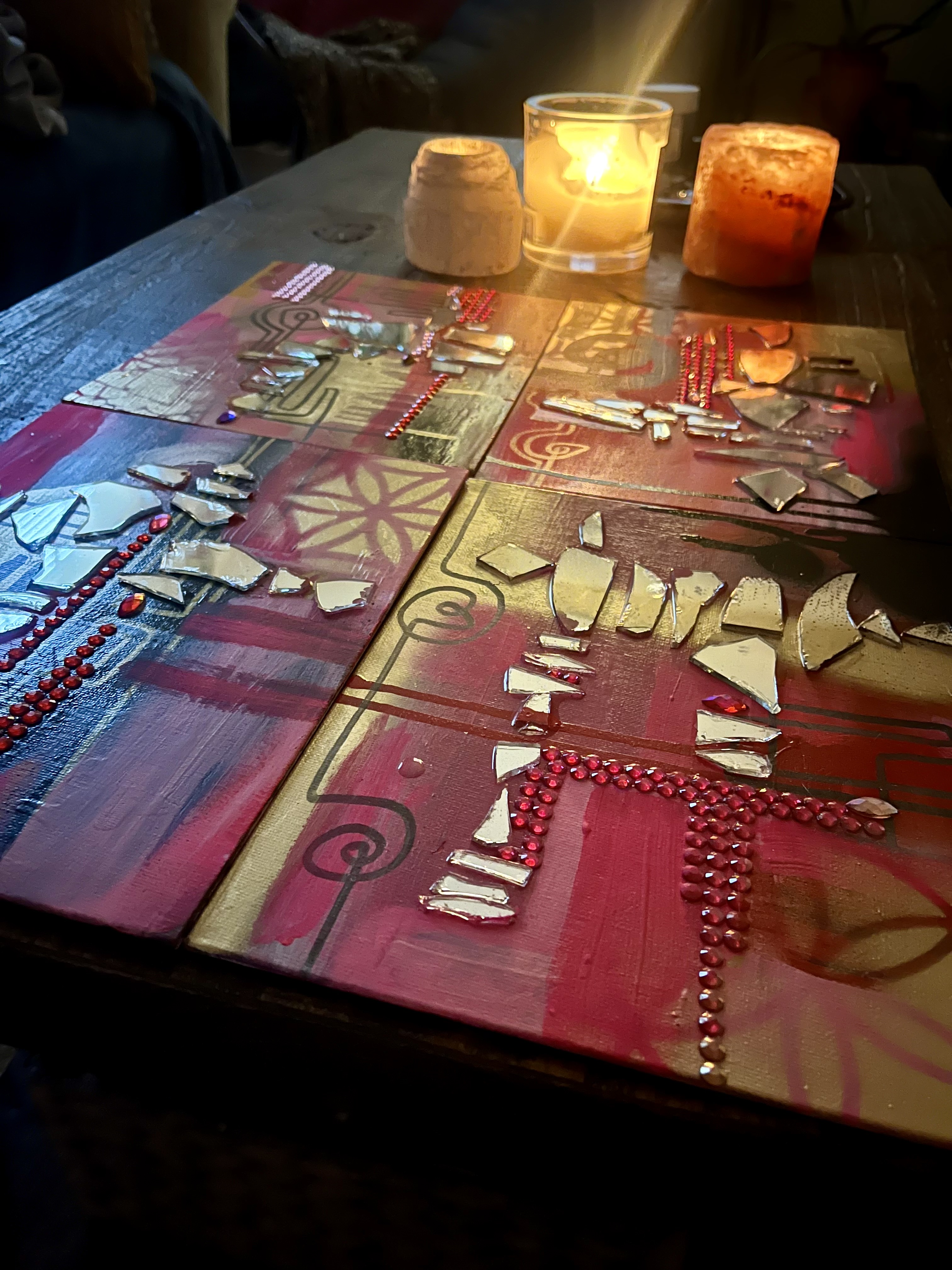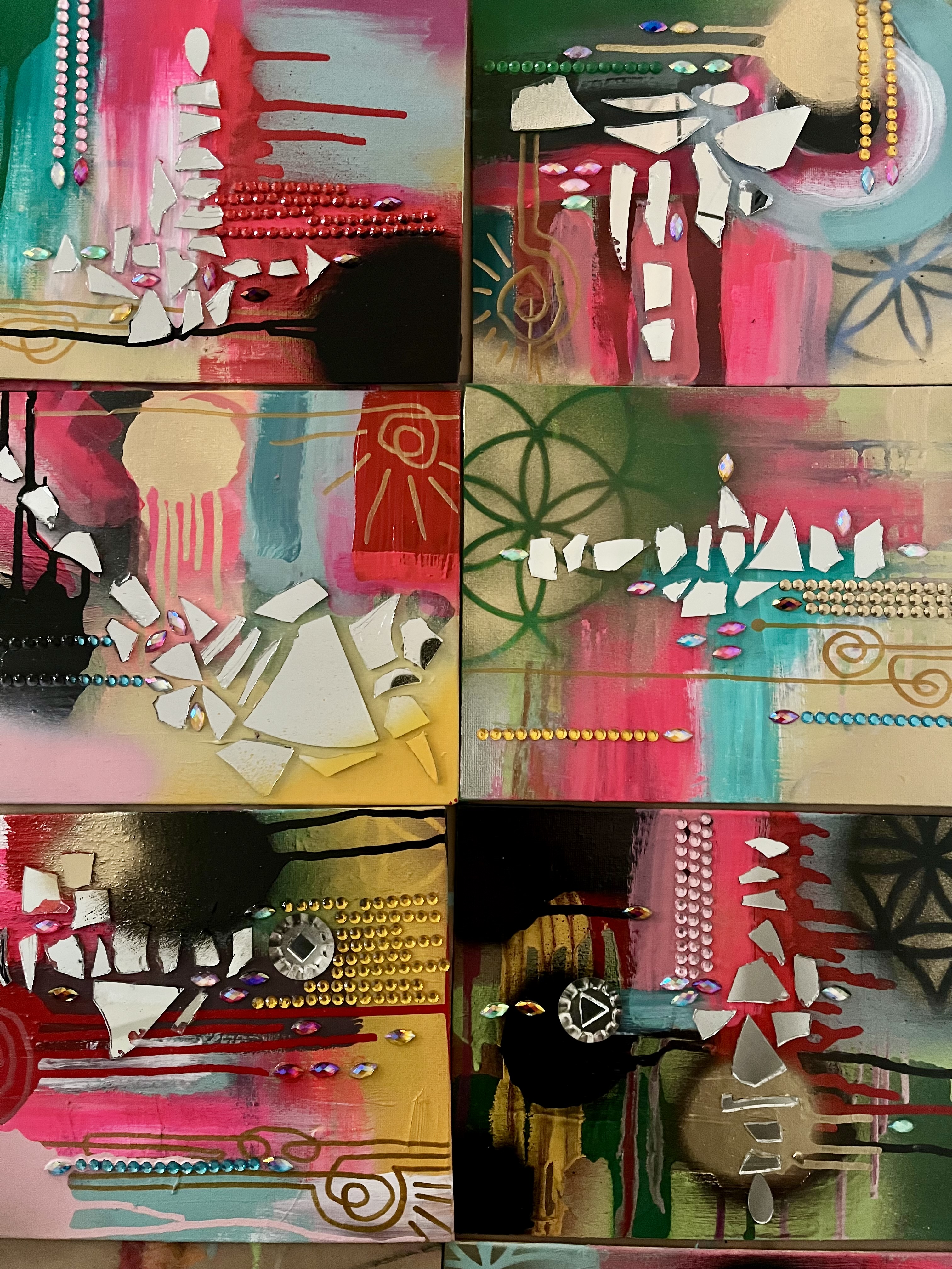 Feeling called to work with paint and brush. Getting away from the screen and back to basics. (Yes, I still do logos and custom illustration) but lateley I've been paying homage to my inner juvenile delinquent;) Working with broken mirrors, spray paint and sparkly rhinestones has been a meditation of sorts. Revisiting the days of art for joy.