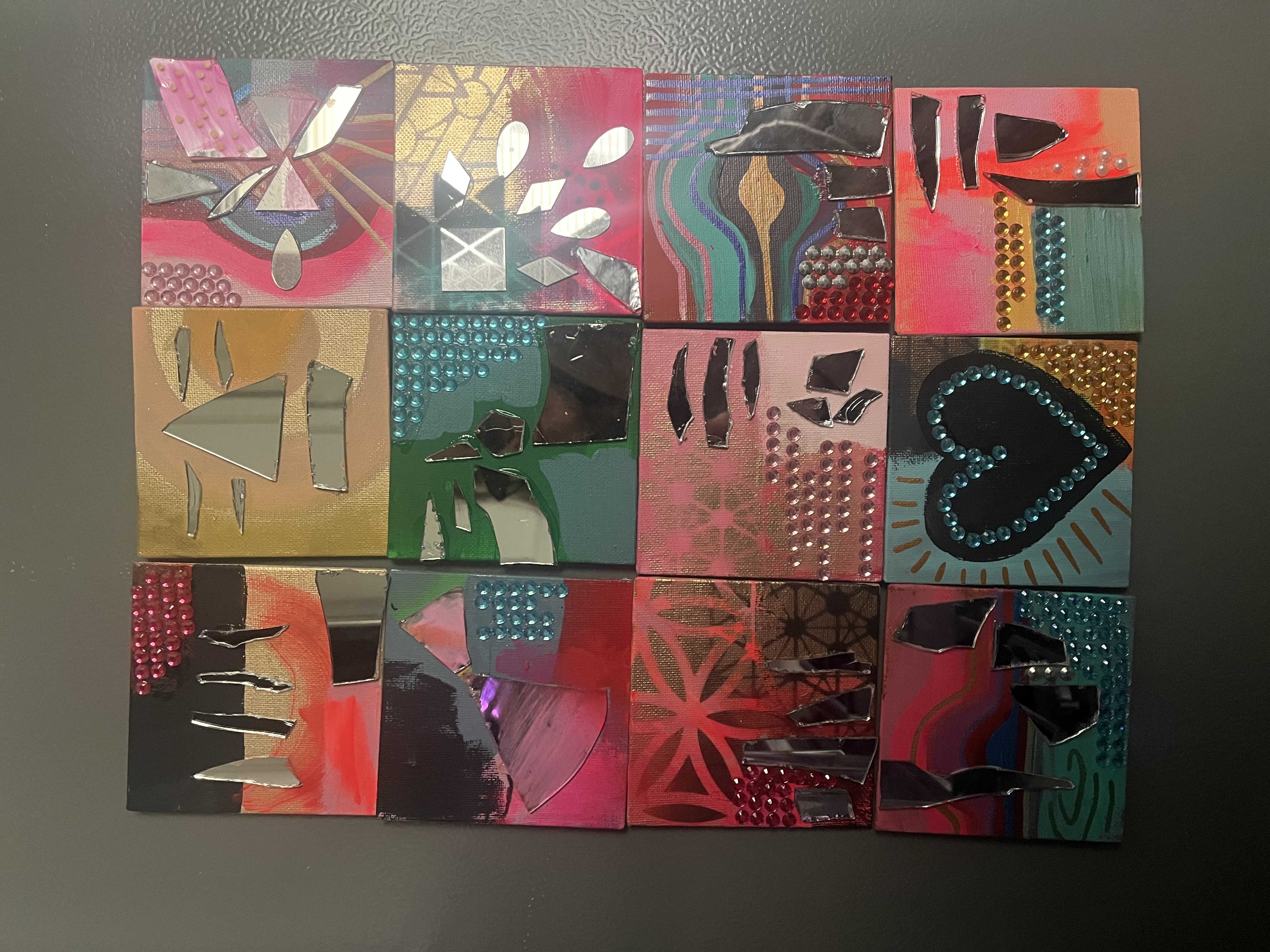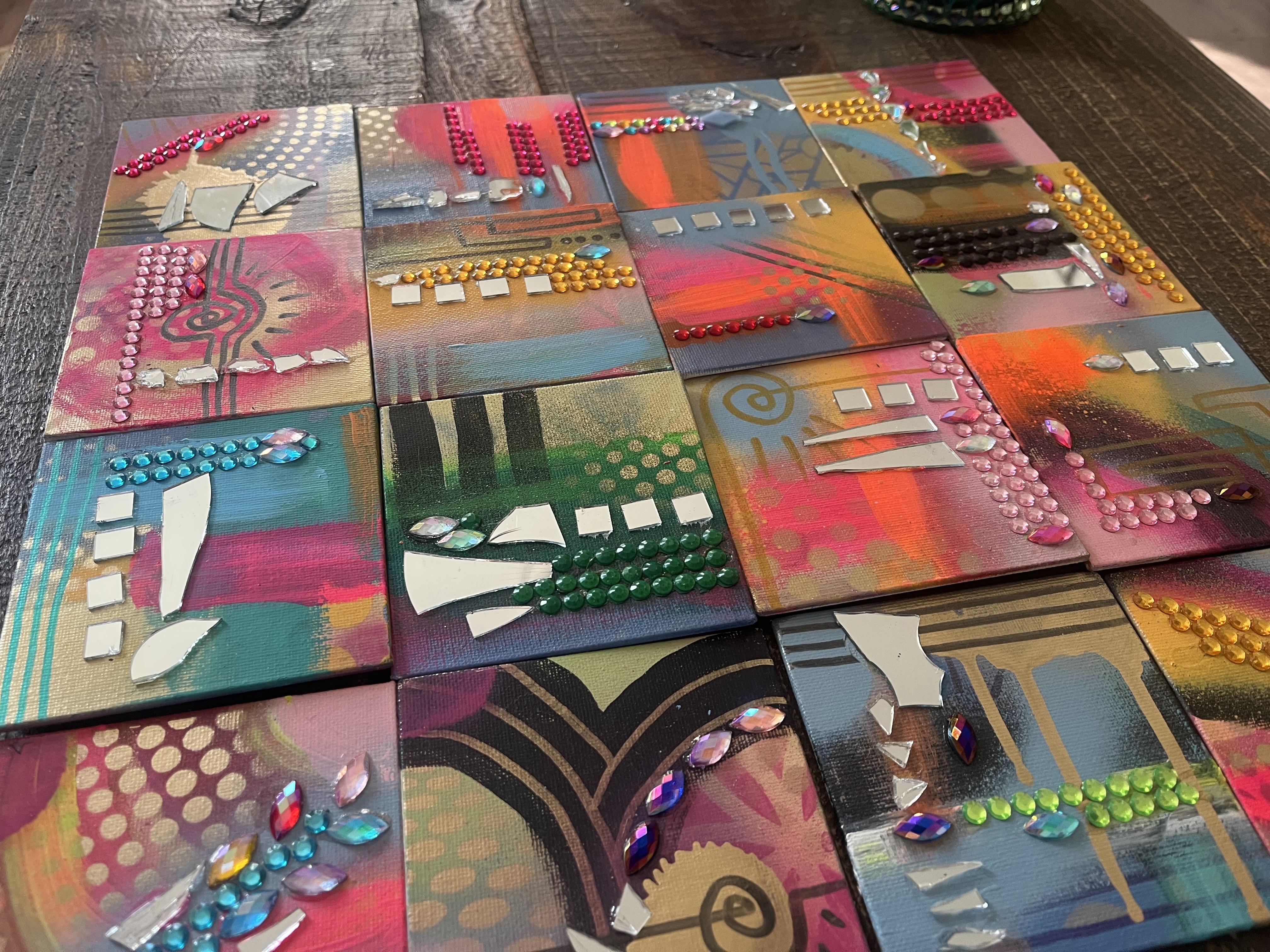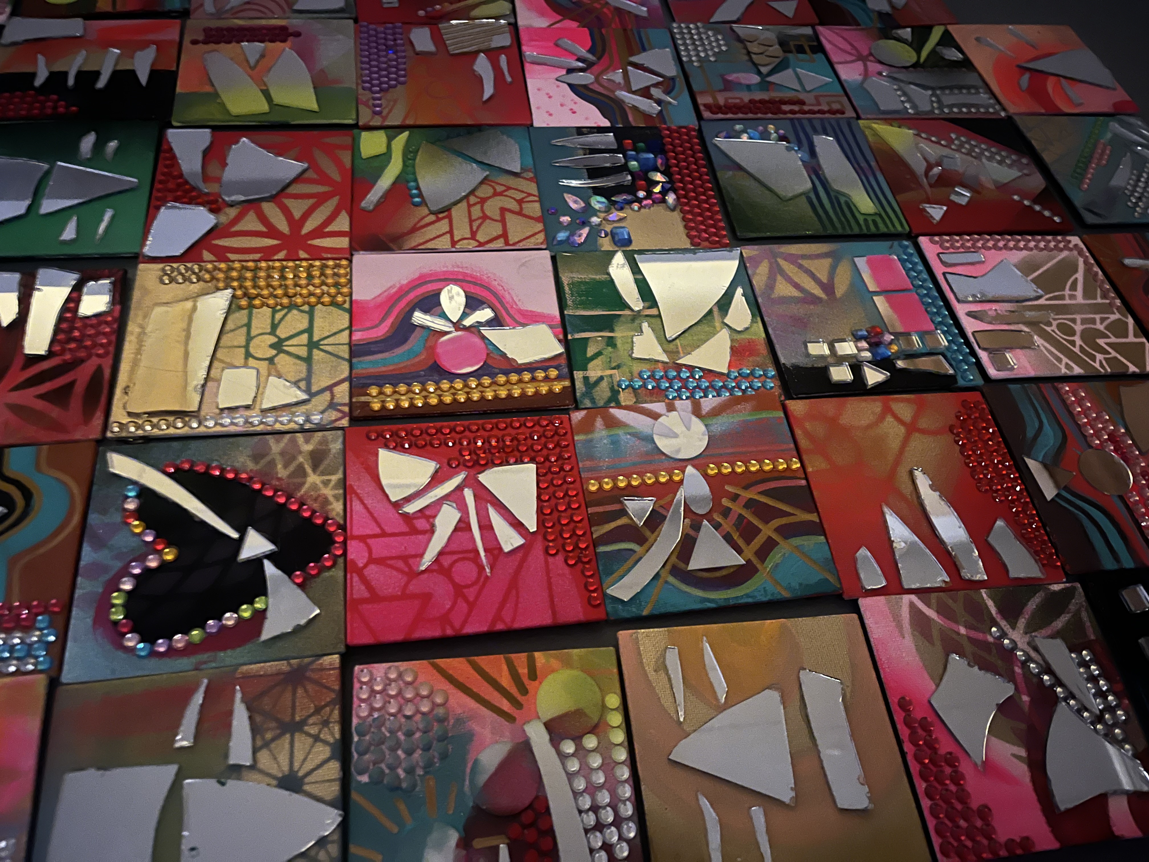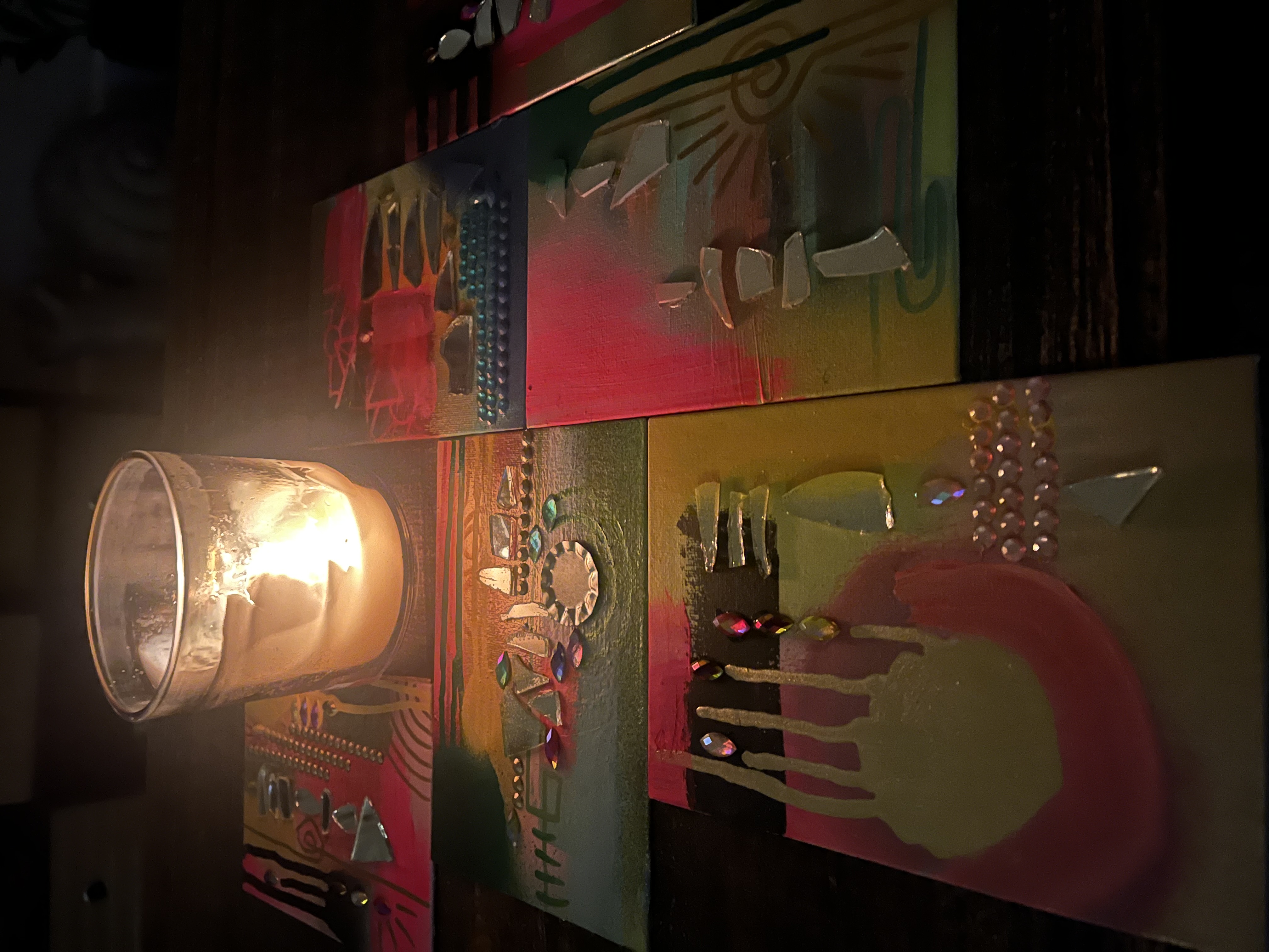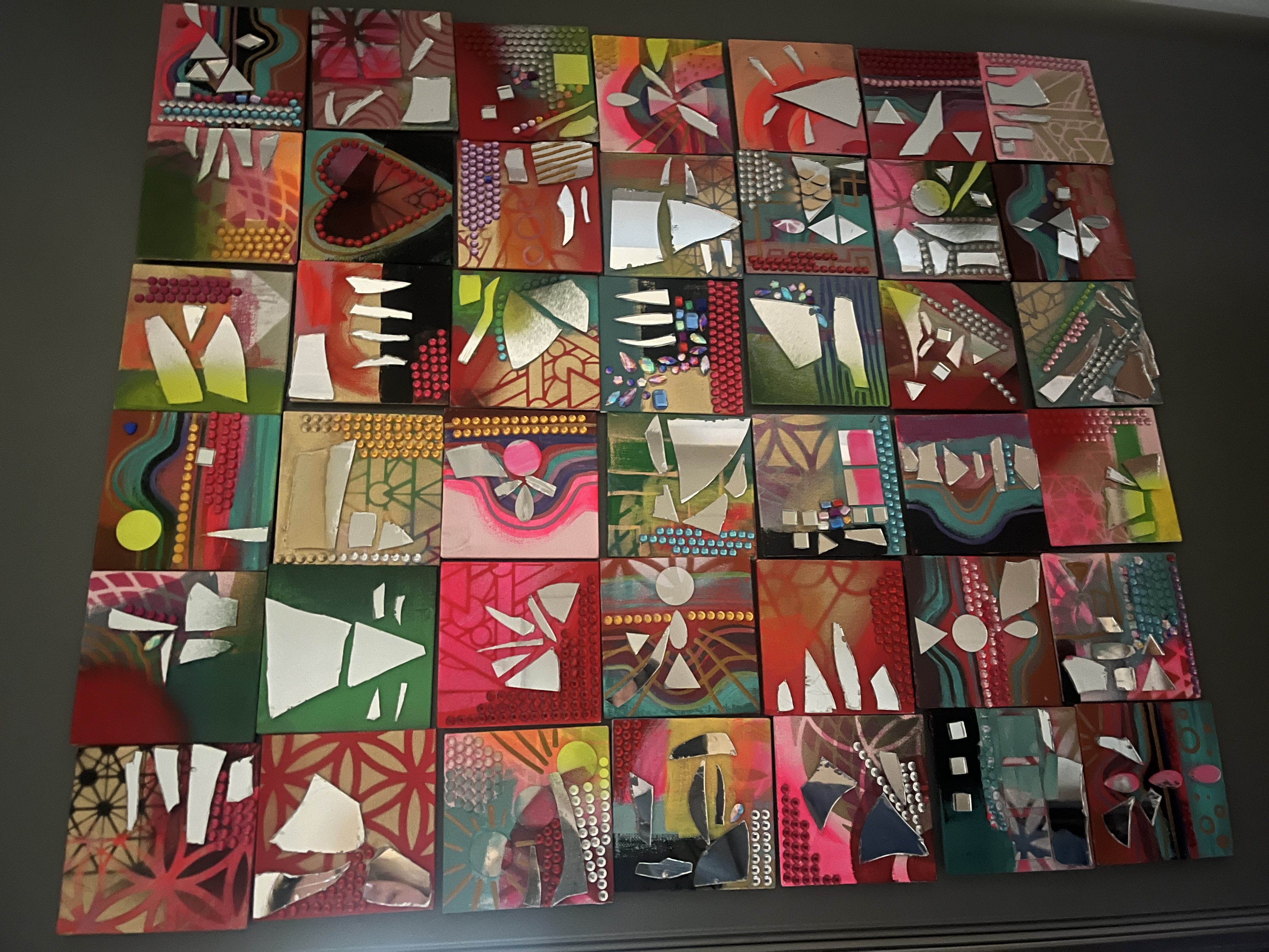 Feeling called to work with paint and brush. Getting away from the screen and back to basics. (Yes, I still do logos and custom illustration) but lateley I've been paying homage to my inner juvenile delinquent;) Working with broken mirrors, spray paint and sparkly rhinestones has been a meditation of sorts. Revisiting the days of art for joy.